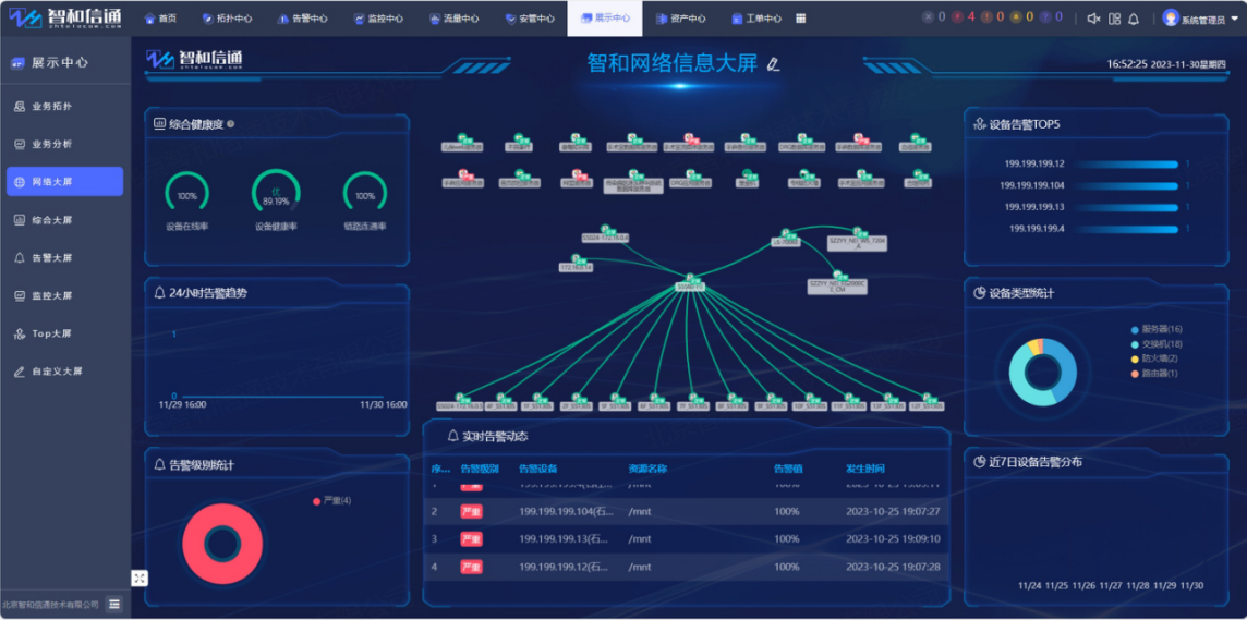 通过部署智和信通统一运维平台,县中医院将全院设备统一纳管,实时对设备运行状态进行监控,得益于平台强大的可视化能力,不但全量设备可视化拓扑展示,而且全网运维数据也在智能分析后,以可视化图表、大屏的方式进行展示。在整体运维工作中,县中医院的运维人员仅需对网络拓扑进行观测,即可第一时间定位故障发生点,极大地提升了排障效率。