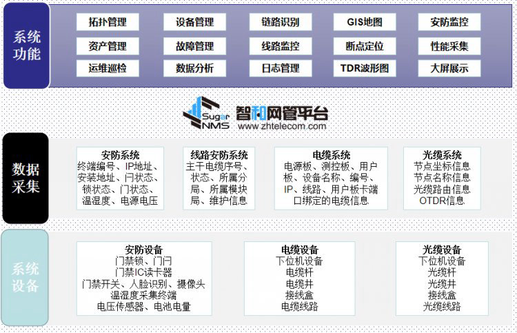 | 智和网管平台将单独运行的光缆、电缆、安防等系统集成管理,原有系统需分别查看状态及配置,通过智和网管平台集成后的综合监控网管系统,实现了三个平台的统一监控,在系统设备统一监控管理的基础上,大数据判断光电缆线路故障断点位置,GIS地图展示,拓扑展示等;除此之外,还实现了门禁开门人脸采集管理及备份存储查询功能。 |