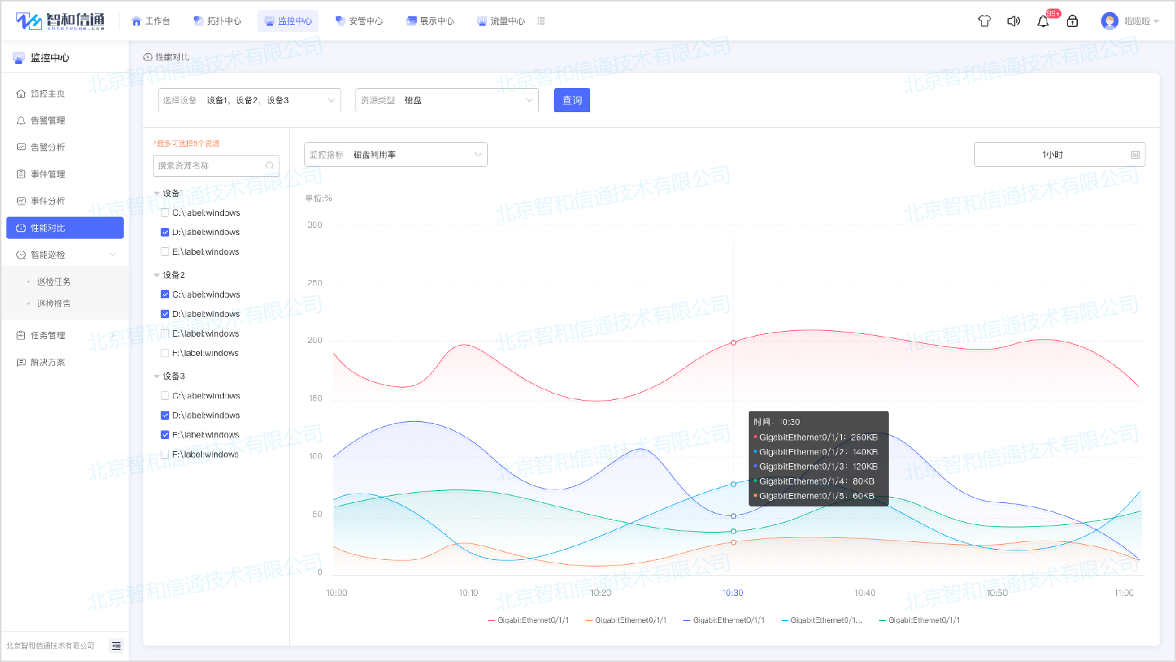 支持选择多个工业交换机进行同维度性能数据分析,提供可视化性能对比视图